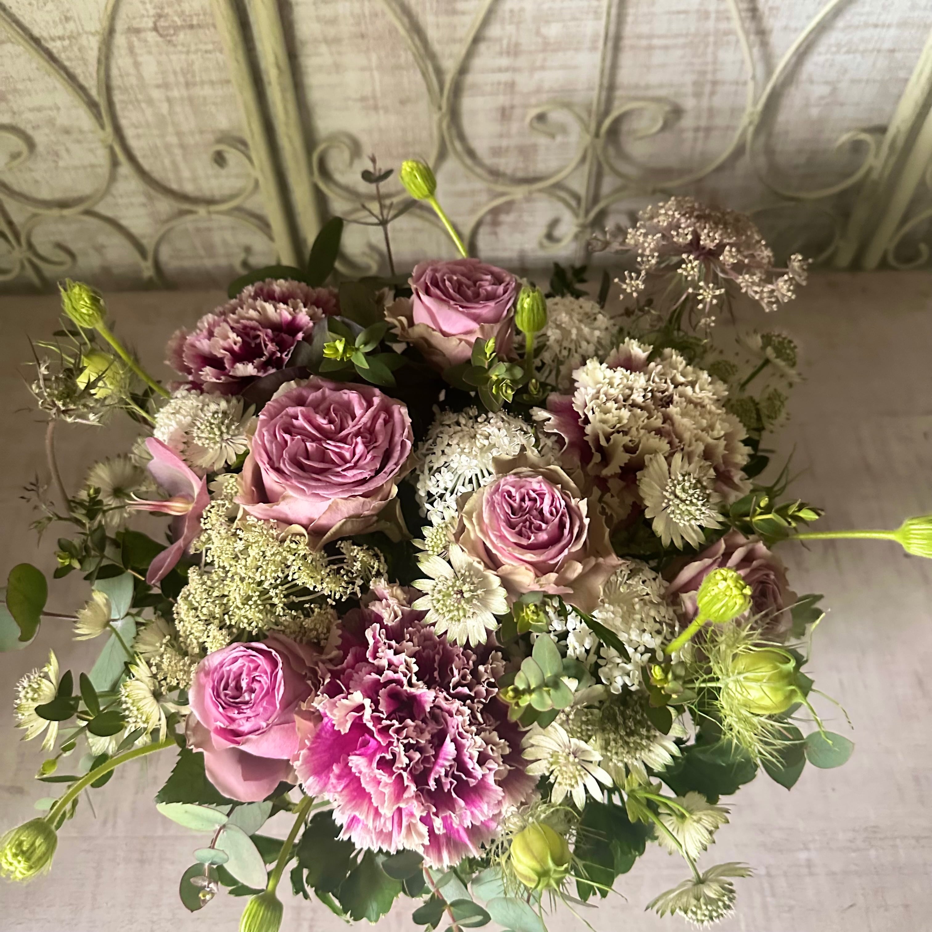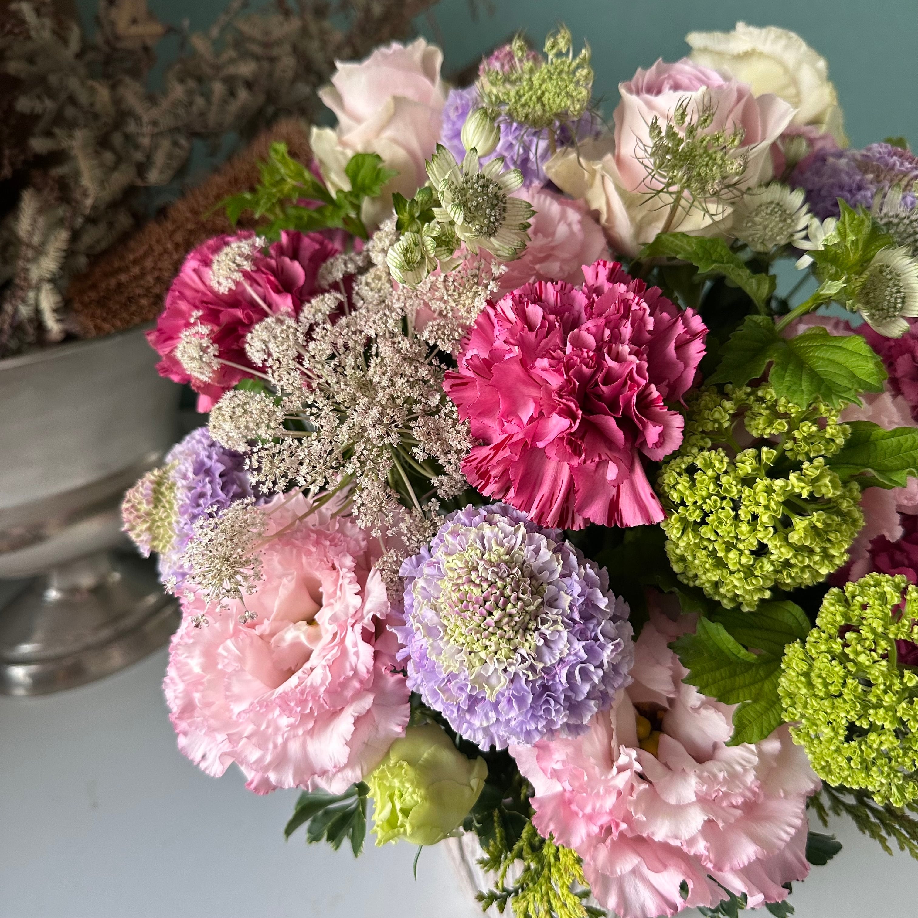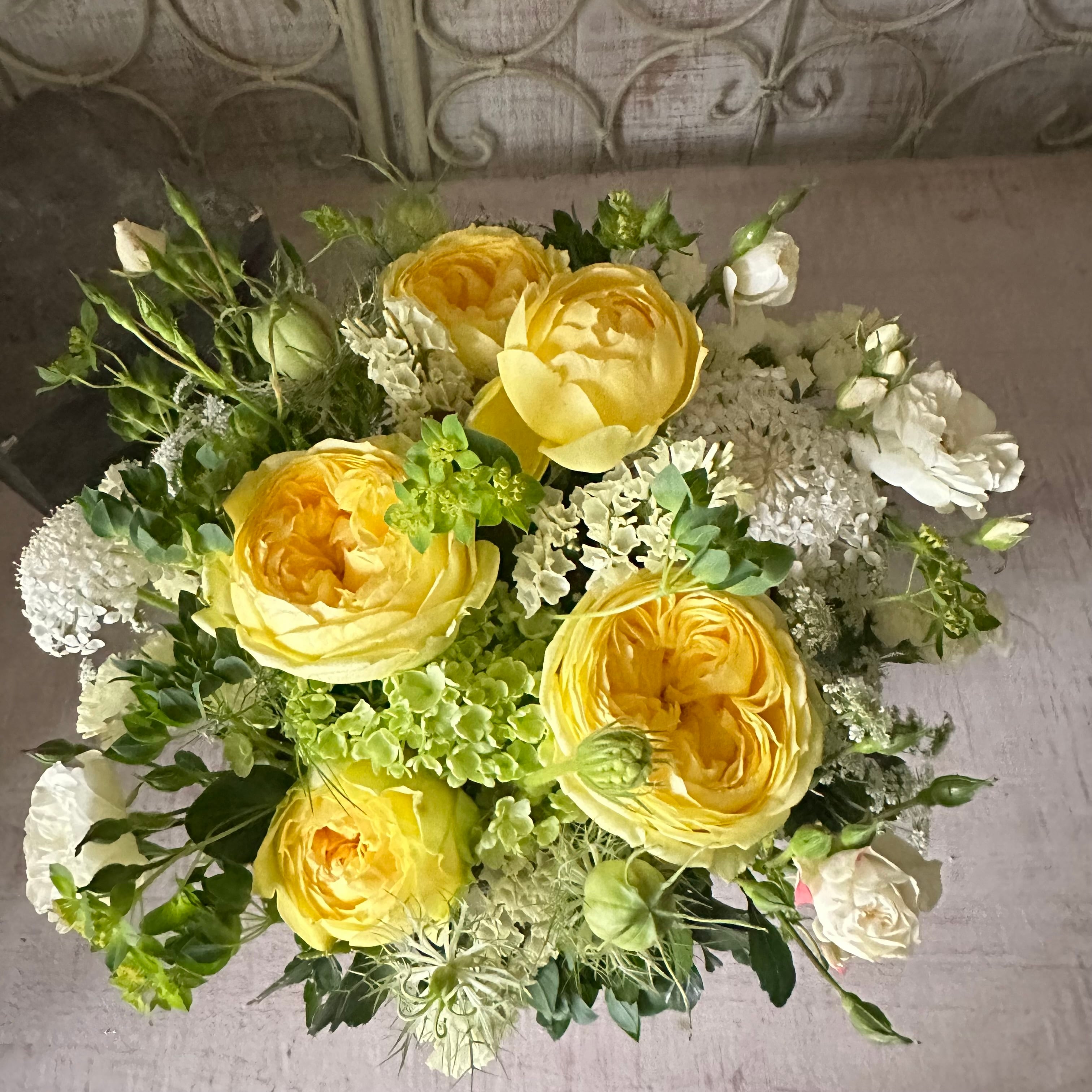 その日の市場で自分の目で見て厳選したお花たちでお作りしますので細かなお約束はできませんが、植物のそのままのチカラが伝わることを大切にしております。